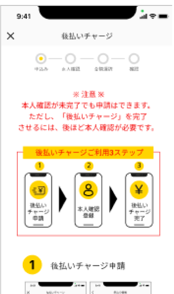 今回のアップデートで後払いチャージの申込み時点では本人確認が不要となり、お借入ができる方のみに後から本人確認をする形式に変更されました。
